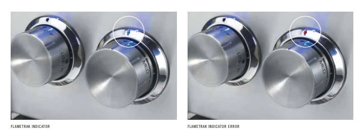 The Flametrak system will notify you with the indicator that is above each knob when any action has been taken. This allows you to check the flame’s status rather than opening the grill hood.